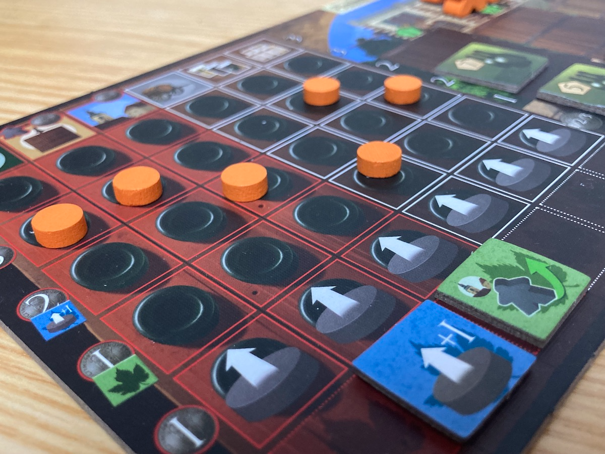 ②ゲームの基本的な仕組みは、各プレイヤーが自分の前に所有する個人ボードによるアクションですね。毎ターン、厳しい決断を迫られます。というのも、各アクションは最大で5回までしか実行できないからです。